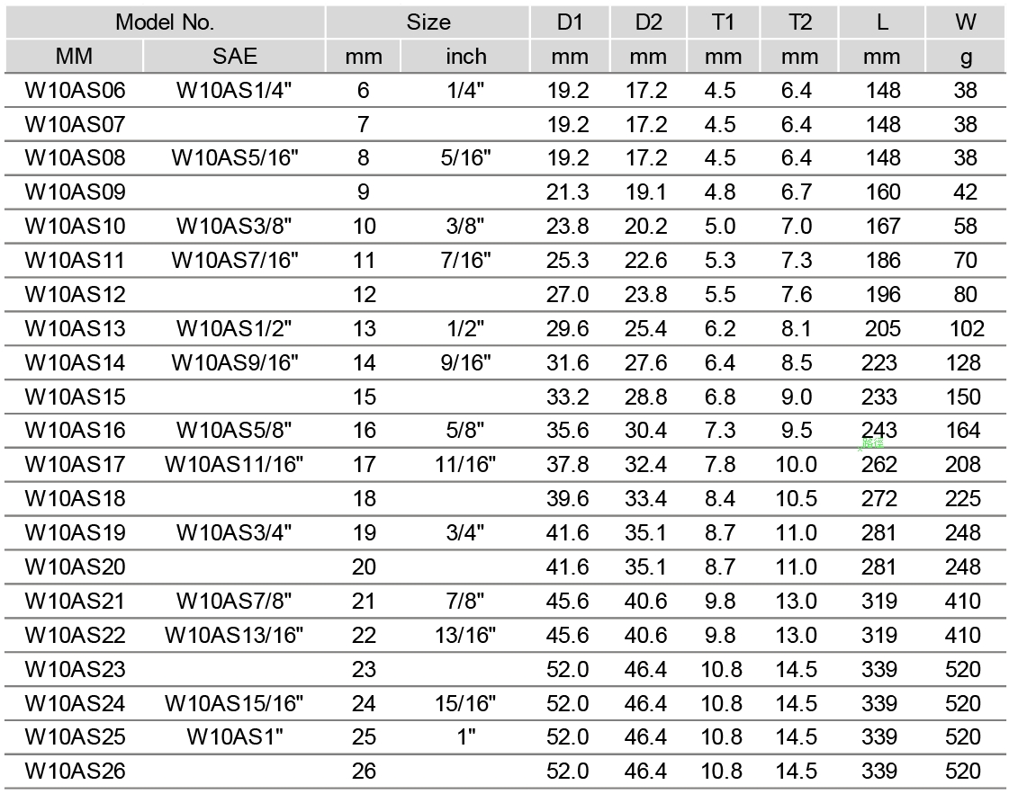 W10AS3/8"/W10AS7/16"/W10AS1/2"/W10AS9/16"
